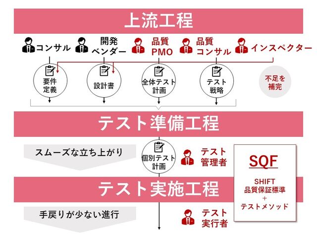 主なミッションは、プロジェクト全体の品質改善を目的とした上流工程からの支援です。SQF(SHIFT品質保証基準)を活用し、プロジェクト推進を行っていただきます。