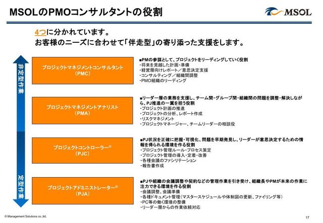 * PMやPMOチーム(ユーザー、ベンダー側のPMO 等)を取りまとめ、クライアントの組織/業務/プロジェクト全体をリードする。